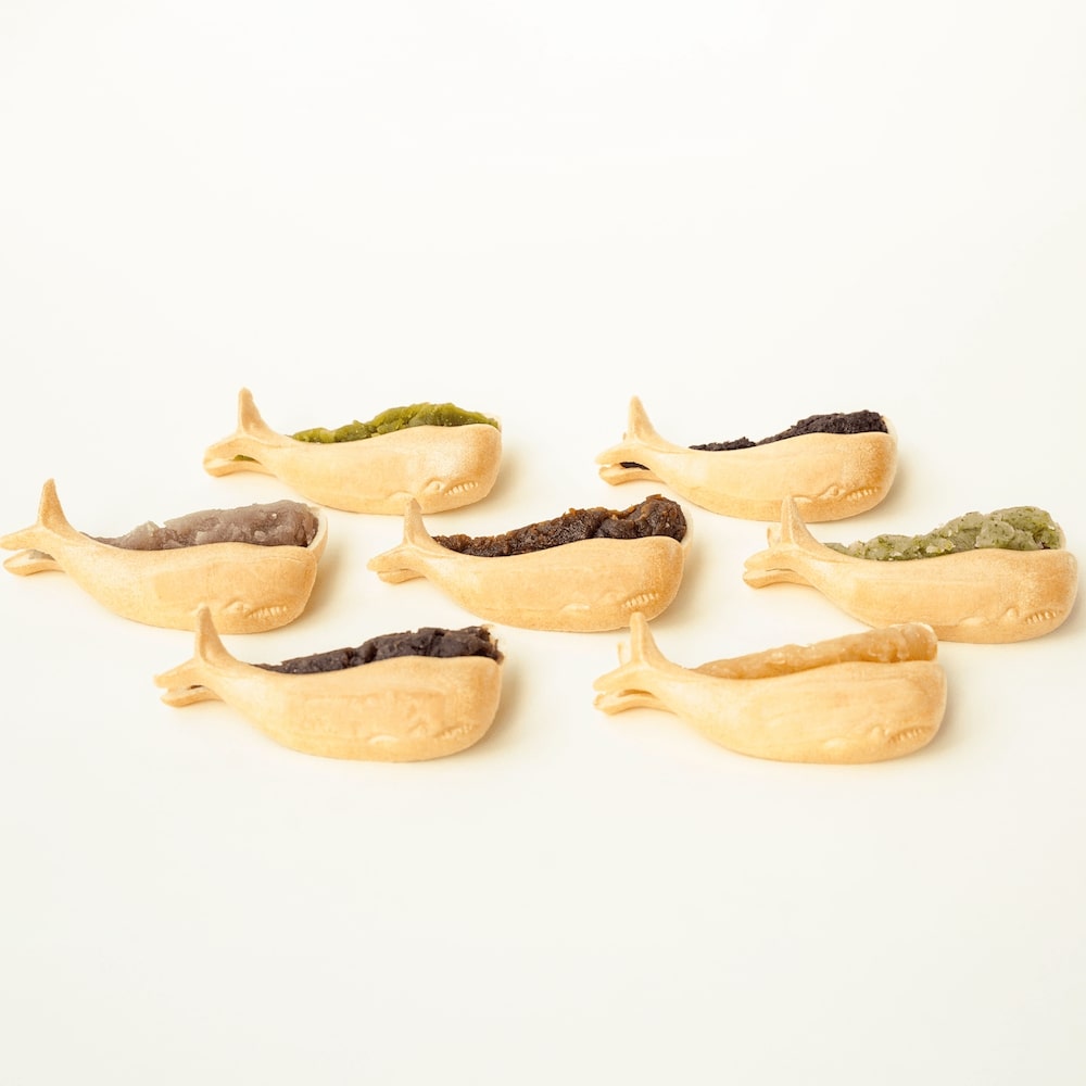 縁起を呼ぶと言われるくじらの姿に、7種の餡を詰めました。保存料・着色料を使わない素材本来のお味をお楽しみください。